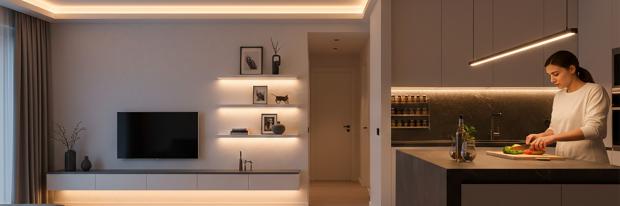Neben der atmosphärischen Wirkung erfüllen LEDs wichtige praktische Aufgaben. Lichtleisten, die unter Hängeschränken montiert werden, sorgen in der Küche für blendfreie Arbeitsflächen, sodass das Schneiden, Kochen und Zubereiten von Speisen auch bei wenig Tageslicht angenehm und sicher gelingt. In Kleiderschränken integrierte Leuchtmittel erleichtern die morgendliche Outfit-Wahl erheblich. Treppenbeleuchtungen erhöhen die Sicherheit im Dunkeln und setzen gleichzeitig architektonische Akzente.